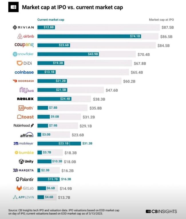 Je joins également une figure intéressante (attention, elle date du 13 mars 2023) qui compare la capitalisation boursière des 20 plus grandes entreprises technologiques qui ont été introduites en bourse après 2020.