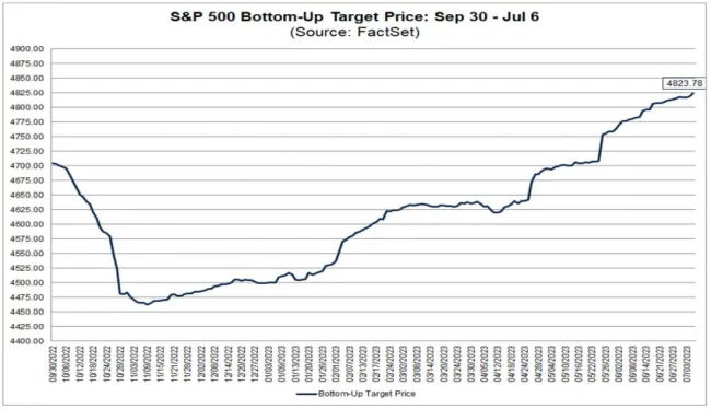 La semaine dernière, une équipe de FactSet a examiné les estimations pour le S&P 500 - c'est-à-dire l'agrégation des objectifs de prix des analystes pour les entreprises de l'indice - et a constaté que les analystes du secteur s'attendent à ce que l'indice atteigne 4 823 au cours des 12 prochains mois, ce qui représente une croissance d'environ 9 %.