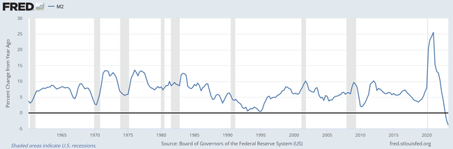 Enfin, l'évolution de la masse monétaire (M2) d'une année sur l'autre. Celle-ci diminue d'une année sur l'autre pour la première fois dans l'histoire en raison du resserrement quantitatif de la Fed, ce qui ne signifie rien d'autre qu'une diminution des liquidités dans l'économie. Cela n'est sans doute pas propice à l'activité économique.