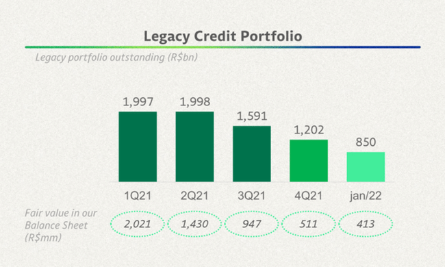 StoneCo $STNE a été en mesure de vendre certaines parties en difficulté de son portefeuille de prêts, mais la direction estime toujours que plus de la moitié de son portefeuille hérité est mauvais. En raison de nouvelles normes réglementaires, la société a suspendu ses prêts aux petites et moyennes entreprises et pourrait se retrouver avec des prêts d'une valeur de 450 millions de reals brésiliens (environ 90 millions de dollars américains) qui finiront par faire défaut.