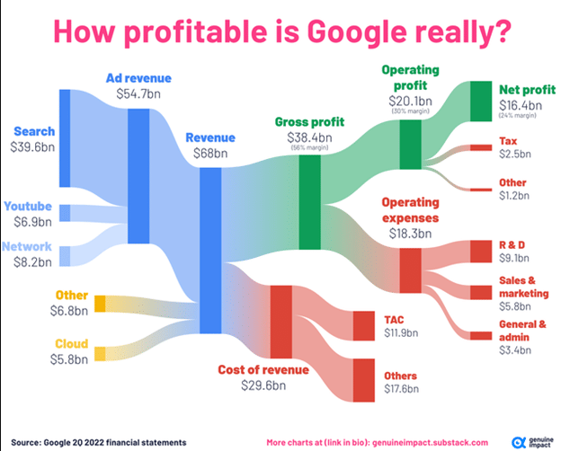 Tout le monde connaît son navigateur et son moteur de recherche. Il est donc évident que la recherche Google représente plus de la moitié des revenus de Google ($GOOG). Mais les revenus de YouTube et du cloud ne sont pas non plus négligeables. Google n'est pas en reste, puisqu'il consacre près de 10 milliards de dollars par trimestre à la R&D (recherche et développement).