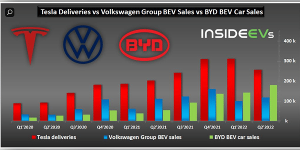 Ok, peut-être qu'il y a quelques autres candidats. Mais il n'y a que deux candidats actuellement en lice pour la première place. Par coïncidence, mes préférés. Le mondialement connu Tesla $TSLA et l'agressif BYD en pleine expansion et prédateur.