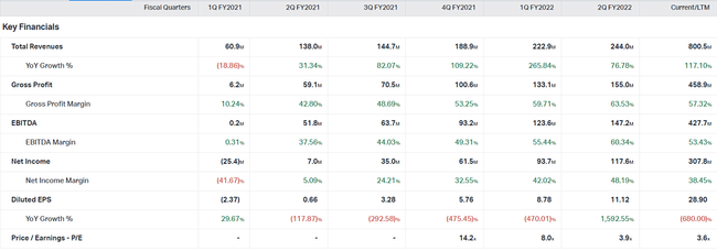 Si l'on jette un coup d'œil rapide aux derniers trimestres en termes de chiffres, on peut dire que l'entreprise améliore ses résultats. Comme on peut le voir dans l'écran ci-dessous, elle a régulièrement augmenté ses ventes de plusieurs dizaines de pourcent, qui ont atteint 244 millions de dollars au dernier trimestre. Parallèlement aux ventes, le bénéfice brut augmente également, mais surtout, la marge brute augmente. L'entreprise a enfin réussi à dégager des bénéfices l'année dernière. La marge nette augmente également rapidement, puisqu'elle a atteint 48 % la dernière fois. D'un trimestre à l'autre, le ratio PE diminue de manière significative.