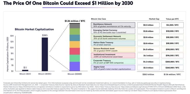 ARK prévoit que la capitalisation du marché des BTC dépassera 28 000 milliards de dollars d'ici la fin de l'année 2030, ce qui donne à un BTC une valeur de 1,36 million de dollars.