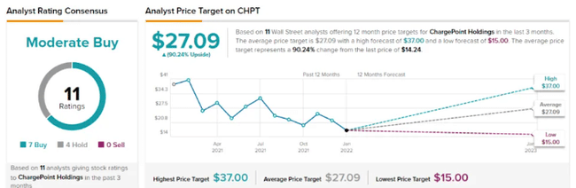 Le mélange d'opinions sur ChargePoint montre que Wall Street est prudemment haussier dans ce domaine ; la note d'achat modéré est basée sur une combinaison de 7 achats et 4 conservations. Le prix cible moyen de 27,09 $ implique une hausse de 90 % par rapport au cours de 14,24 $.