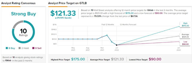 La note consensuelle Strong Buy pour GitLab, qui est maintenue à un ratio de 8:2 entre les notes Buy et Hold, montre que les pairs d'Auty à Wall Street sont d'accord avec sa position haussière. L'action se vend à 67,56 $ et son objectif de cours moyen est de 121,33 $, ce qui est encore plus optimiste que ce qu'admet Auty - et suggère une marge de progression de 79 % cette année.