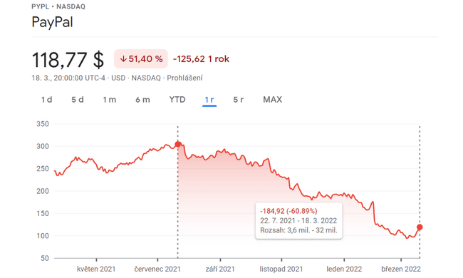 Lesactions de PayPal $PYPL ont connu une chute massive au cours de l'année dernière en raison d'un certain nombre de revers partiels. La première était une réduction des prévisions de bénéfice par action, en raison des craintes d'une croissance effrénée de l'entreprise, qui envisageait à l'époque d'acquérir Pinterest (PINS). Le déclin de l'utilisation des paiements sans contact, dû à des problèmes de chaîne d'approvisionnement, a également contribué à la baisse du titre.