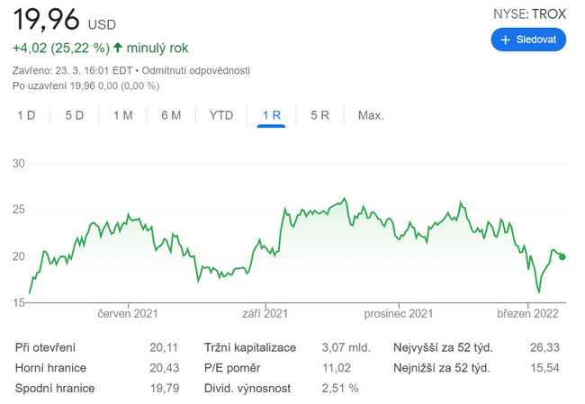 Tronox $TROX, basé à Grimsby, est l'une des actions minières de matériaux et a connu une baisse de plus de -15% jusqu'à présent cette année. Le producteur de minerai de titane et de dioxyde de titane verse actuellement un dividende de 0,13 $ par action, avec un rendement de 2,51%. C'est un bon chiffre comparé au rendement du secteur de 1,52 % et au rendement du S&P 500 de 1,44 %.